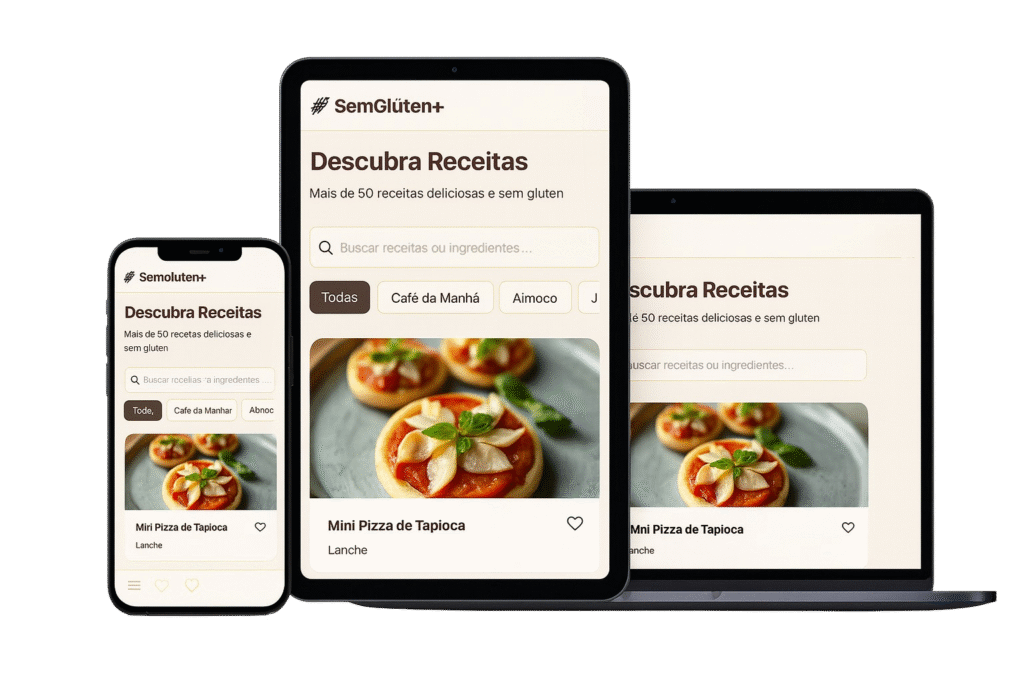 O app oferece receitas para todas as refeições do dia, desde o café da manhã até sobremesas, passando por lanches rápidos e pratos principais. Tudo sem glúten e com opções fáceis de fazer.